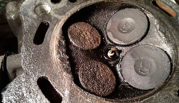 Регулярно высокая температура и давление. Именно при таких условиях работают внутренности мотора. В результате трения деталей возникают зазоры, через которые смазка проникает в цилиндр. Начинается, так называемый, масложор. Масло сгорает и образуются твердые остатки, которые оседают на детали. Больше покрываются коксом все детали, находящиеся на пути следования масла и его продуктов сгорания: стенки, лицевые плоскости поршней, наружные края клапанов, а также и паз для поршневых колец.
