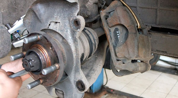 - Демонтировать колесо со ступицей. Гайку ступицы следует освободить от фиксатора и начать откручивать, затем следует слегка открутить гайки или болты колеса. Приподняв сторону автомобиля, где осуществляются ремонтные работы, на домкрате снимается вначале колесо. Затем следует осуществить демонтаж суппорта, шаровой опоры, приводного вала и ступицы (шаровую опору и приводной вал необходимо демонтировать только при замене ступицы переднего колеса).