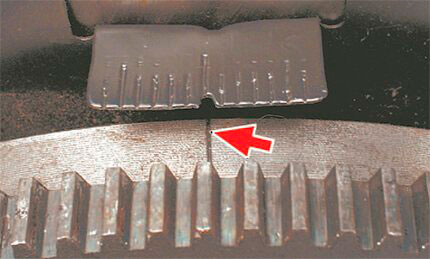 - Совместить метку на шкиве коленвала с отметкой на корпусе двигателя. Очень простой способ, но может использоваться только на полностью собранном и отрегулированном силовом агрегате. Способ очень точный, но только при отсутствии значительных зазоров между выемкой на шкиве и шпонкой коленвала. При износе фиксатора или его отсутствии могут отмечаться очень значительные отклонения, которые не позволят выполнить работу по определению ВМТ первого цилиндра без использования специального оборудования. При длительной эксплуатации или во время неосторожного выполнения ремонтных работ риска на шкиве коленчатого вала может быть повреждена, что также может сделать невозможной точную установку положение первого цилиндра в верхней мертвой точке.